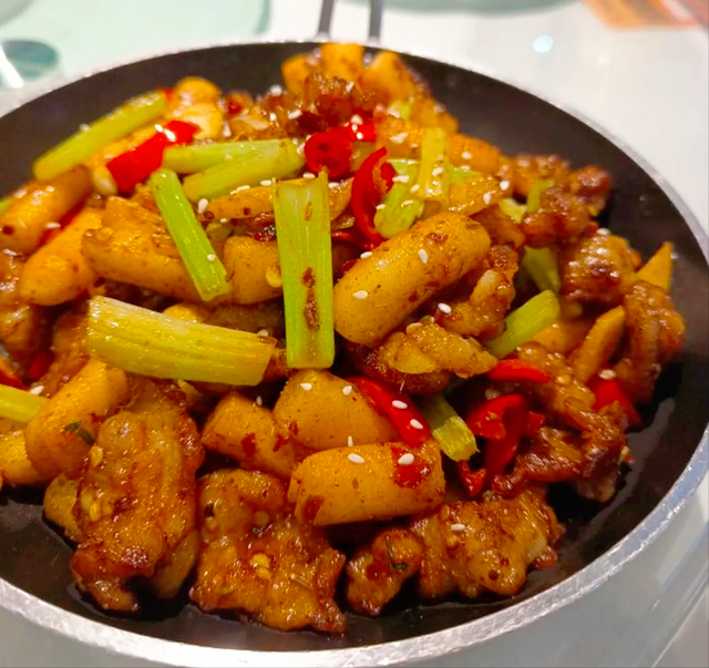 ④热锅冷油,放入蒜子、姜片和辣椒炒香。倒入芹菜、年糕和脆骨,加少许盐翻炒均匀后撒点芝麻就可以食用了。