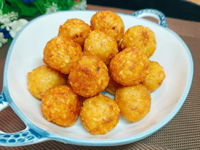 ③锅中烧油,油温达到6成热的时候放入米饭团炸。颜色金黄时捞出来,沥干油脂就可以食用了。
